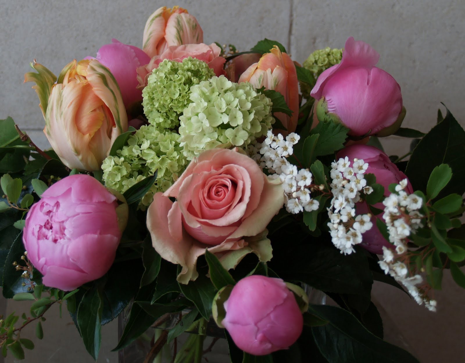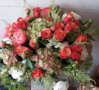 beautiful arrangement of hydrangea, Picante roses, coral peonies and spirea!