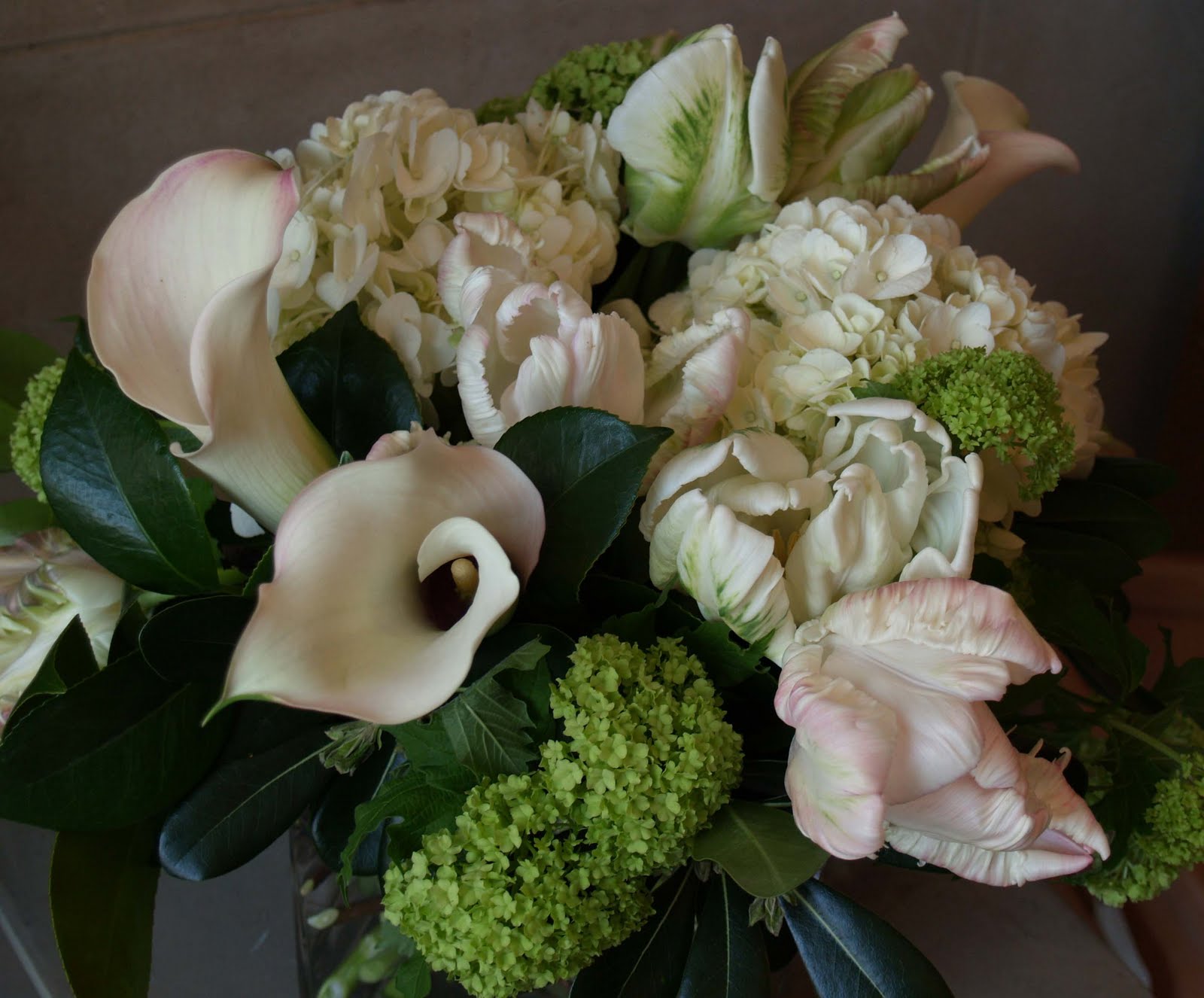 It has been a crazy week, just finishing up the large function at the Four Seasons last Thursday, then starting off this week with Professional Administrative Assistant's Day... caught us a little off guard!! However we managed to get out many beautiful spring arrangements. Some of our favourite flowers - ranunculus, peonies and parrot tulips have been in short supply due to the Volcano ash keeping out the flights from Europe. Not only were we busy with PA day, we were also donating 22 centerpieces for The Women's auxiliary dinner for The Hospital for Sick Kids, as well as 9 bud vases of soft blush callas for their cruiser tables.
