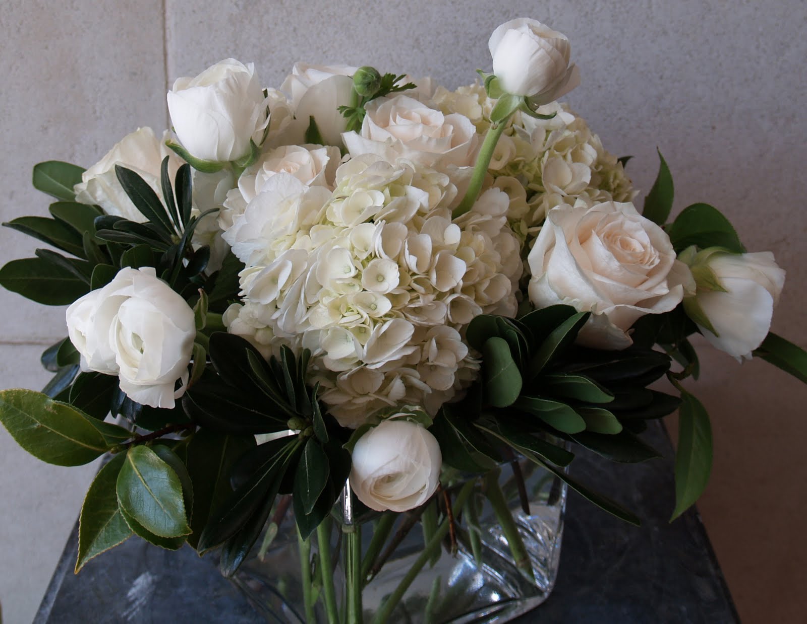 now from CRAZY to elegant, an all white arrangement of hydrangea, ranunculus, viburnum and roses