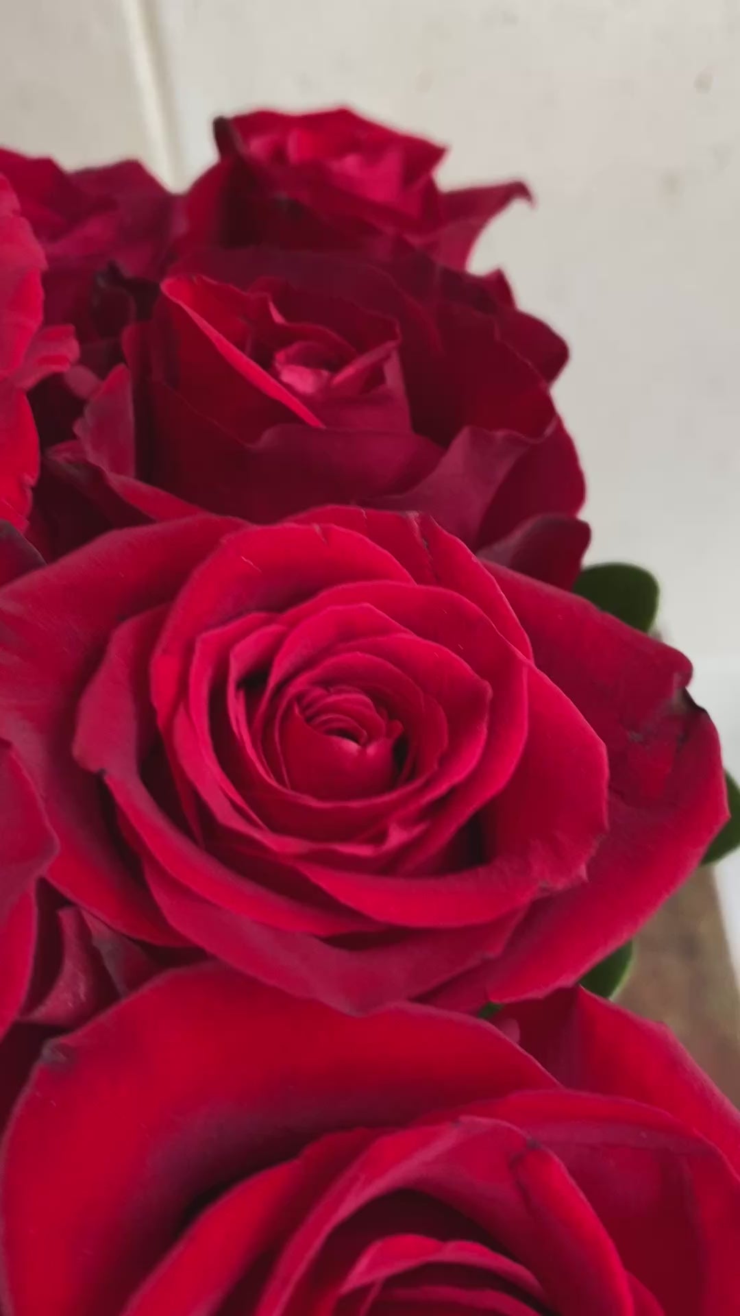 16 rich red freedom roses in a leaf lined glass cube vase. Trimmed with greenery